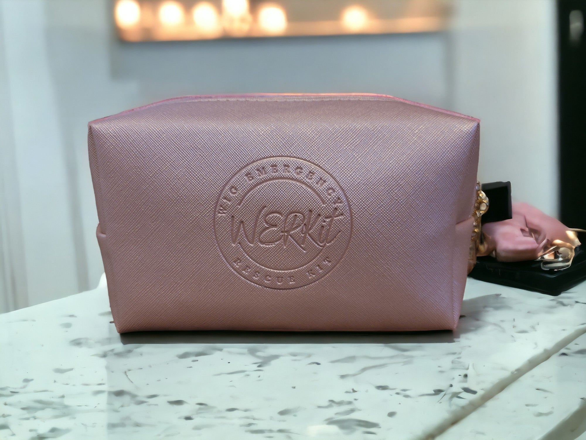 Get ready to transform your wig game with The WerKit, Wig Emergency Rescue Kit!!! This innovative product comes with 4 HD wig caps, 1 melt band, a bottle of melting spray, a lace glue pen, an edge control brush, an applicator brush, a tweezer kit, including scissors and razor, a mirror, an alcohol pen, all beautifully packaged in a Luxury cosmetic bag.